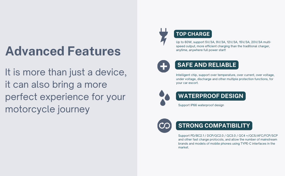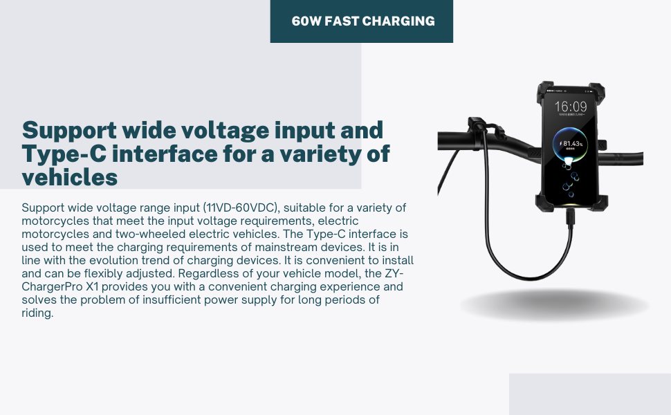 “Our ultra-fast QC3.0 charger is designed for walkers who need a reliable power source. With dual USB and Type-C ports, this versatile charger supports 5V/9V/12V fast charging for lightning built-in voltage regulation safety protection, including overheat, overcurrent, overvoltage, overvoltage and equal drainage protection, as well as input circuit overvoltage and anti-short circuit protection. Its durable, weather-proof design guarantees performance in all operating conditions. The included safety stand keeps your device stable and within reach — perfect for powering your smartphone, GPS device, and more while riding in your car.