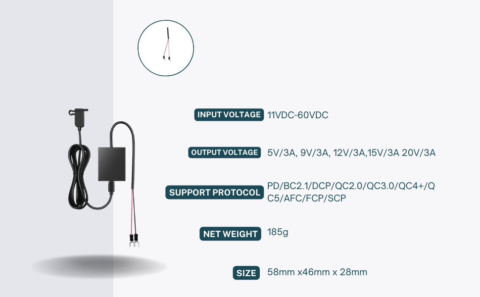 – Output: 5V/3A, 9V/3A, 12V/3A, 15V/3A, 20V/3A